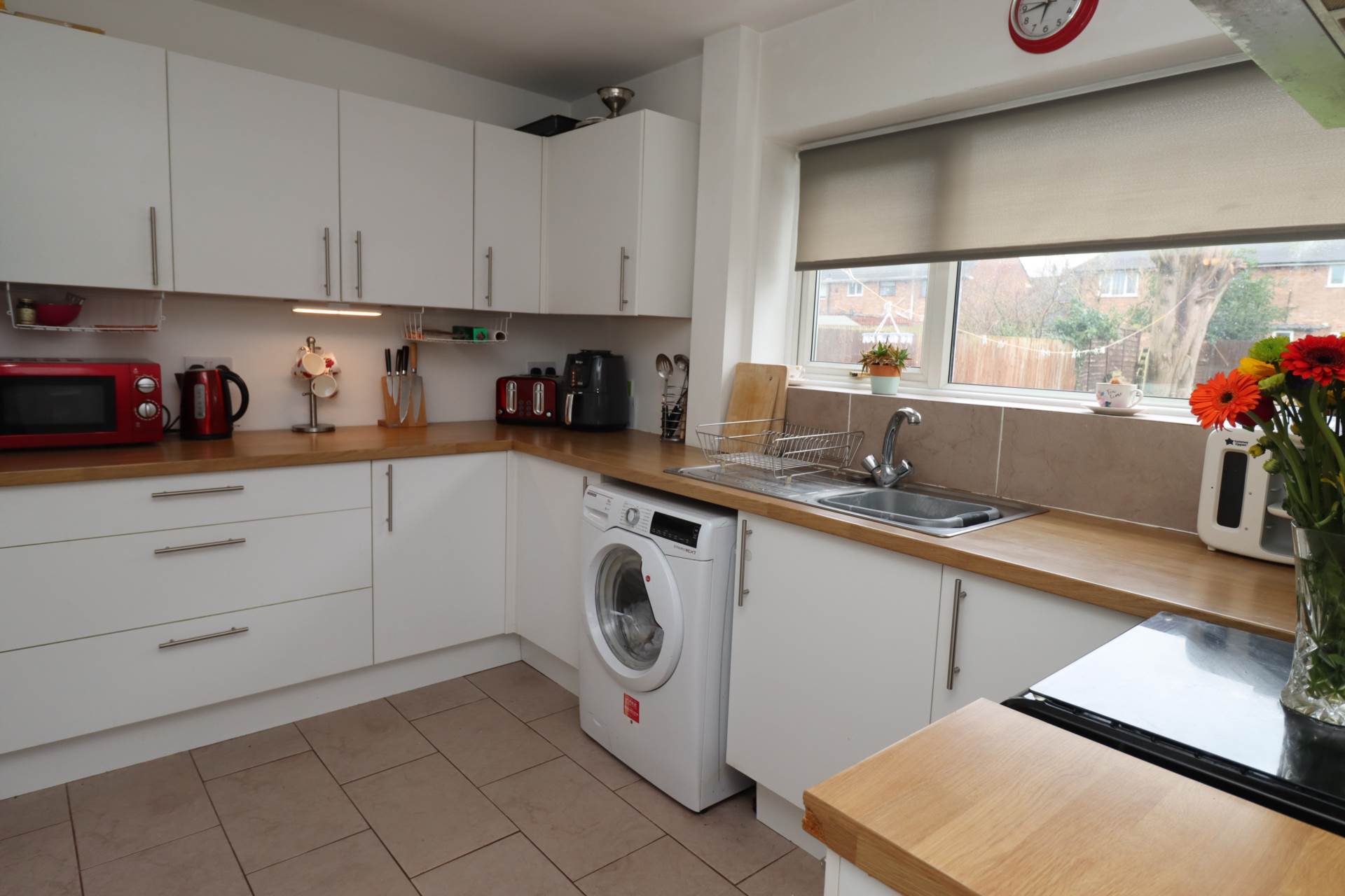 The modern kitchen is both stylish and practical, featuring contemporary fittings, ample storage, and a bright window overlooking the rear garden. A side door provides convenient access to the outside.